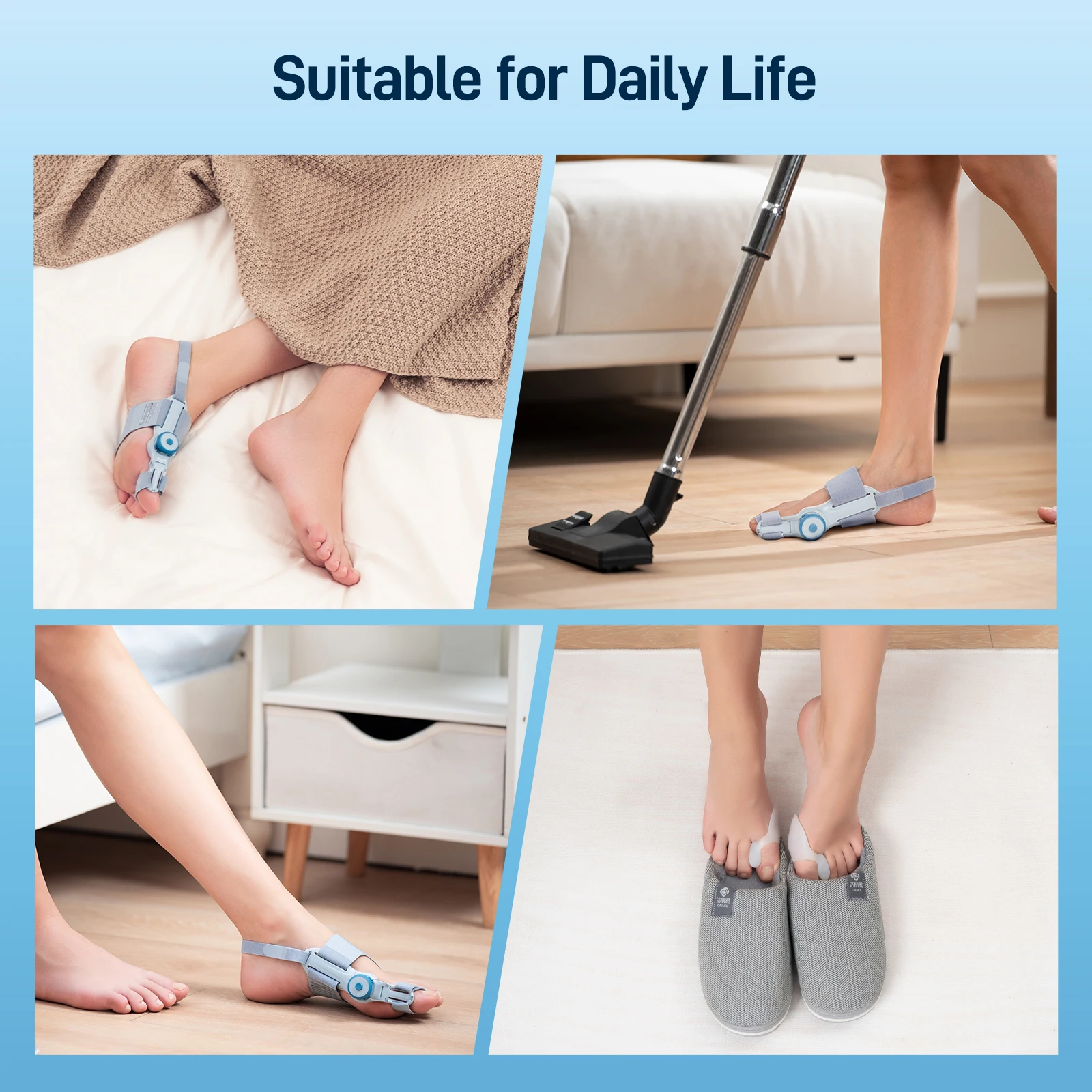 [Personalized adjustment]Best bunion corrector can be flexibly rotated 180° and adopts a unique tension design,which can be customized according to individual foot shape and needs. Toe Corrector closes with an easily adjustable Velcro strap. This Velcro-like strap ensures a custom and secure fit,allowing the bunion corrector to stay in place throughout the day. (Not suitable for wearing shoes)
