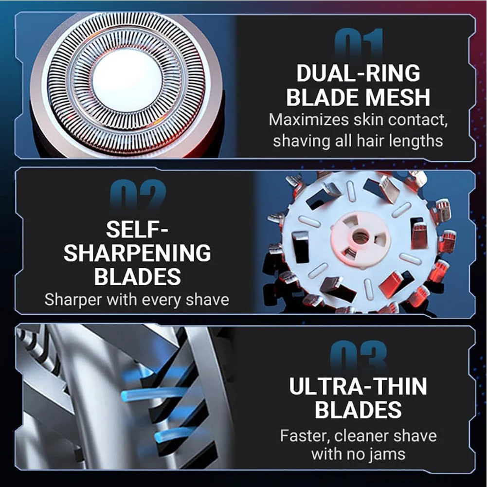 1. Mini Electric Shaver: Experience superior shaving with our mini electric shaver, featuring 15 sharp stainless steel turbo blades and a 0.1mm ultra-thin foil. The dual-ring 3D mesh increases shaving efficiency, smoothly removing hair from the root for a finish.